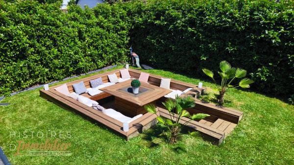 Le jardin se compose d'un coin terrasse aménagé intimiste ainsi que d'un espace brasero semi enterré.