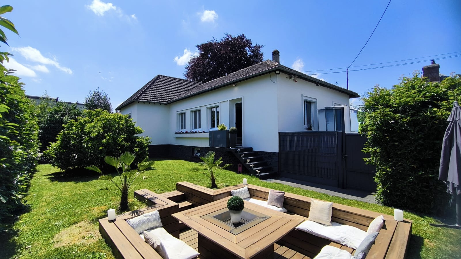 Le jardin se compose d'un coin terrasse aménagé intimiste ainsi que d'un espace brasero semi enterré.